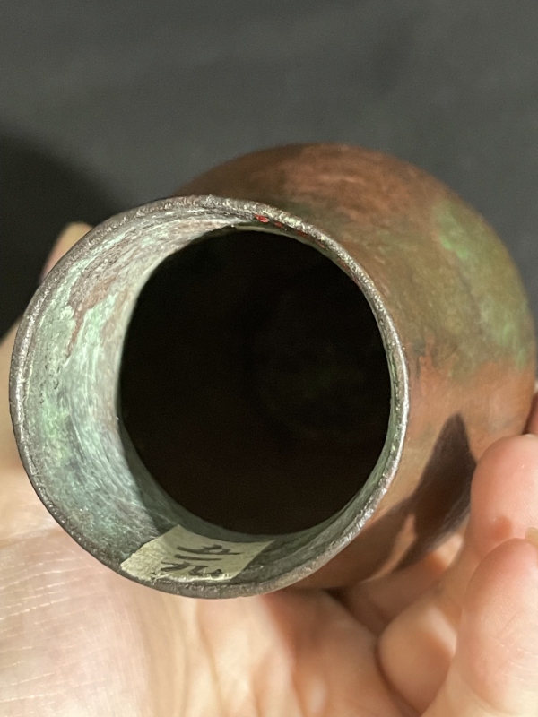 錞于,形如圆筒,上部比下部稍大,顶上钮。钮多作虎形,故常有“虎钮錞于”之称。此虎钮錞于腔体较高,盘口外侈,鼓肩,自肩向下急收,腰部呈筒状,底为平口,盘口素面,口沿饰虎钮,昂首倨牙,长尾斜垂,尾端向上卷曲,虎身有简易纹饰。因年代久远已绣色斑驳。