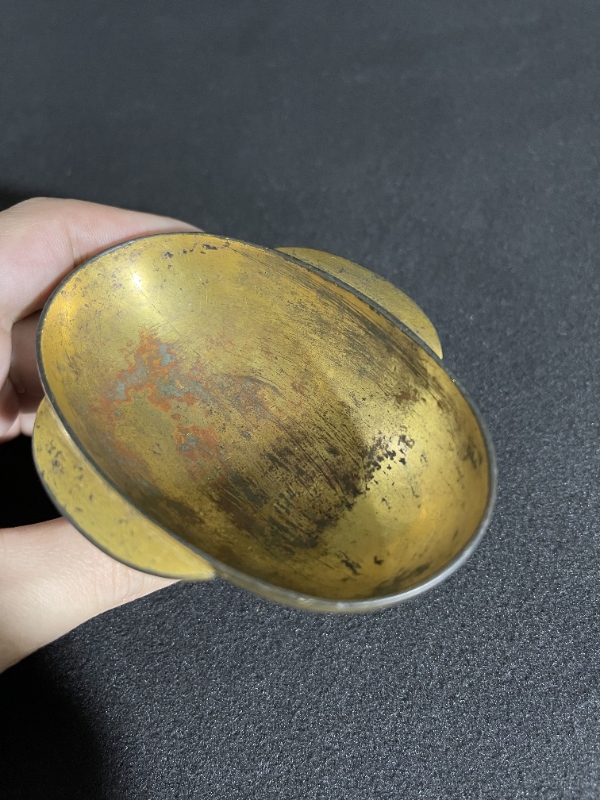 耳杯,平底椭圆,附双半月耳,耳如翼,故又曰羽觞,为古人宴饮酒器。成形于先秦时期,《楚辞·招魂》有述:“瑶浆蜜勺,实羽觞些。”以羽觞盛瑶浆,尽是取乐之欢,宾主之兴。至两汉时期,耳杯兴盛,《汉书·外戚传下·孝成班倢伃》云:“顾左右兮和颜,酌羽觞兮销忧。”汉代耳杯从胎体材质到制作工艺皆趋于鼎盛,漆、陶、铜、玉、琉璃等材质争奇斗艳,现存世量而言,漆质耳杯最为常见,铜制少有,此为一例。此耳杯亦椭圆平底,杯体腹深胎薄。耳胎厚,外延壁渐向内收。西汉时期耳杯双耳向上高于口沿,至东汉时期,其耳基本与杯口持平。此耳杯内膛及双耳鎏金。应为上流士族之专用,精巧华贵。
