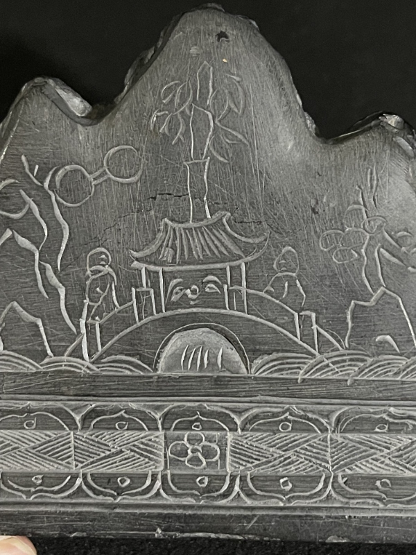 这件笔山黑石刻制而成,缜密压手,外壁塑山峦状,布局高低错落,五峰之中刻画有“秋山图”。描绘山树和双鹿,林木茂密,溪水潺潺,双鹿穿行期间,身姿矫健,动感十足,风格鲜明,表现力强。春水与秋山的取材于北方少数民族春秋围猎的场景,题材多为描绘自然景物,包括山石树木和飞禽走兽等,这一类题材在辽金元时期非常盛行。纹饰写实,雕工细腻,层次分明,富有立体感和层次感。既实用,又有很高的赏玩价值。为典型元代文人文房用具。黑石融自然山川于案头,置笔后寓山水于笔端,层峦迭嶂,高低起伏,韵律流动,笔架由大气的刀法促成,包浆自然,可观可玩。